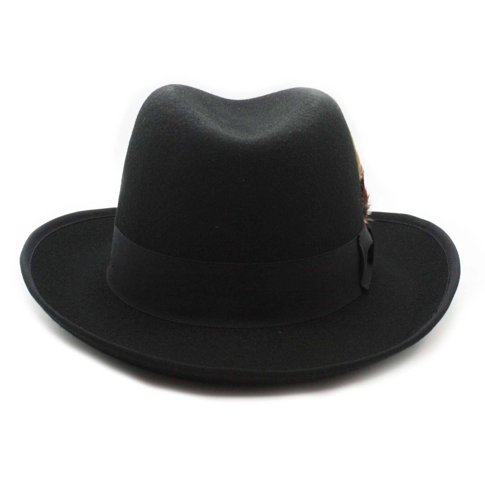 This distinguished and elegant Godfather style hat will add timeless style to any outfit. Constructed of 100 percent wool felt, this hat is finished with grosgrain ribbon trim with a feather accent and has a fully lined plush interior. Features: * 100% Wool Felt * Grosgrain Ribbon & Feather Accent * Crown: 5.25 inches high * Brim: 2.5 inches
